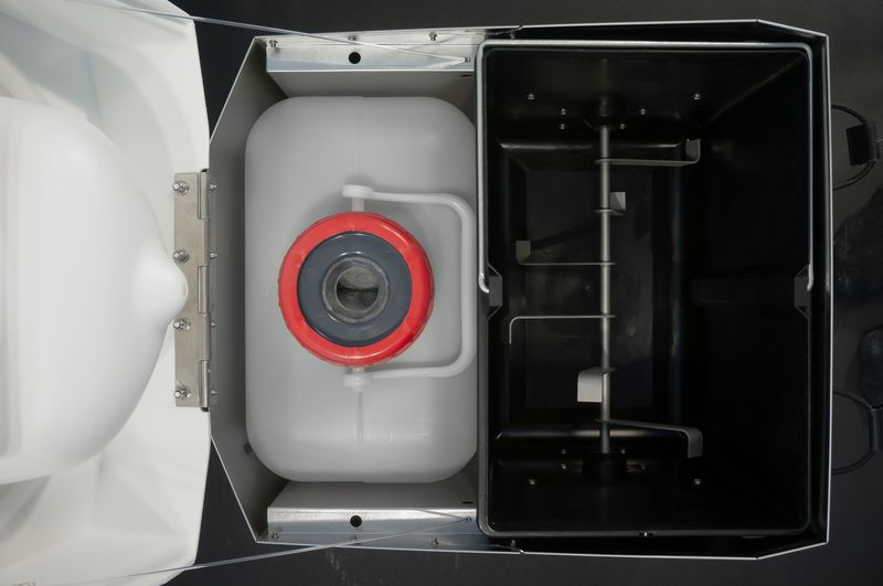 - Urine tank with patented odor trap, cap nut and extra large spout for quick emptying