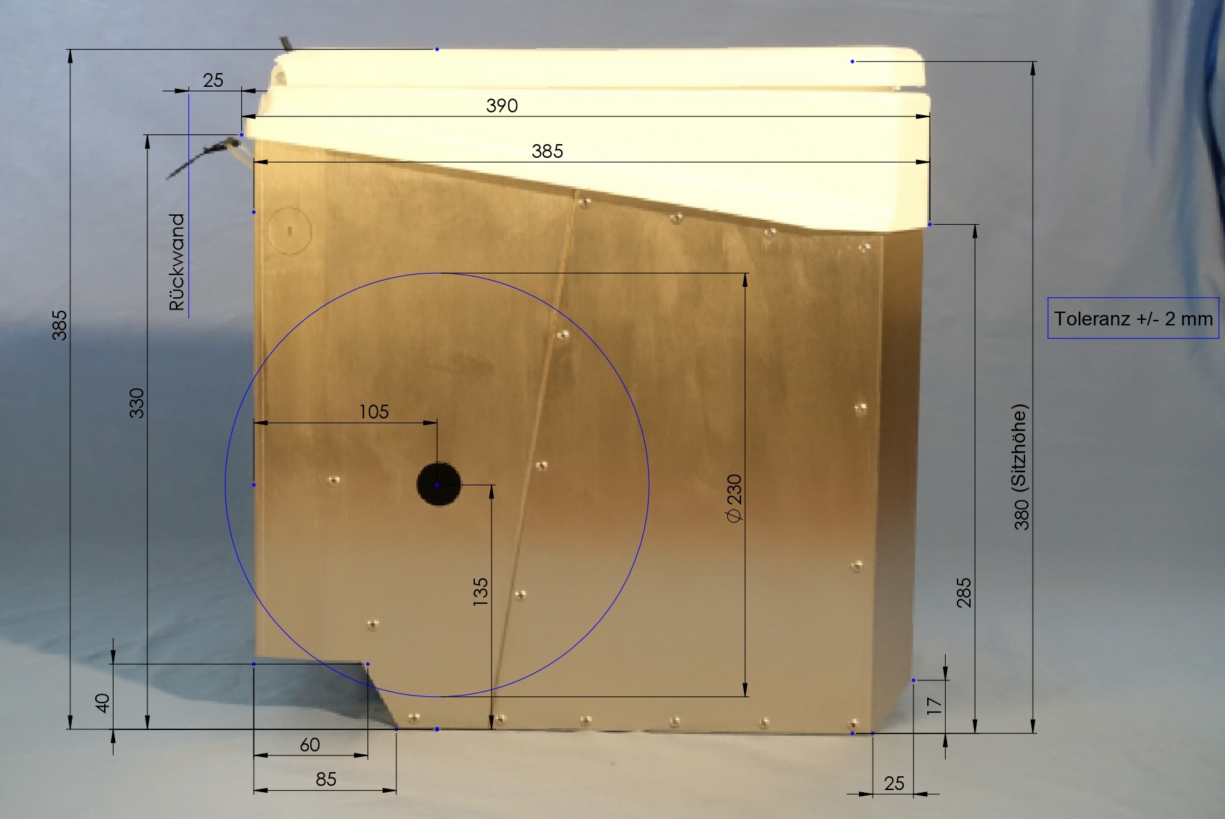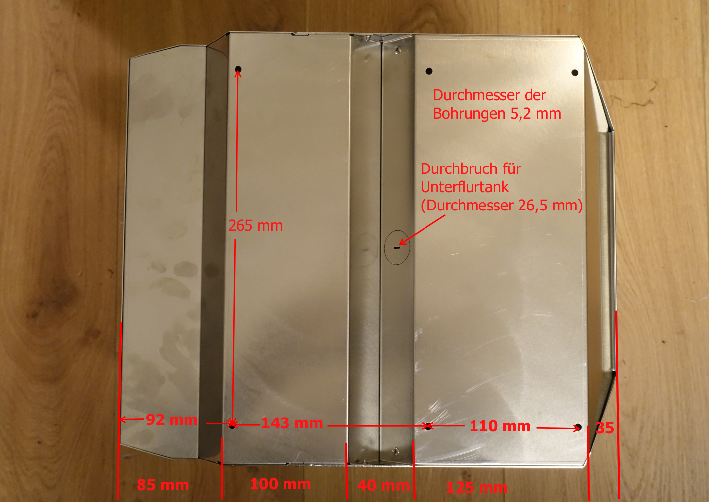 There are already six holes for mounting prepared in the base plate. In addition, an opening is prepared in all housings to lead a 3/4" drain hose to the outside. This allows the urine to be drained into an underfloor tank (UTA models). The maximum total height with the lid open (lid vertical) is 730 mm.