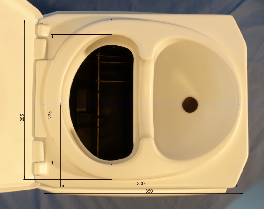 When storing in a toilet compartment of the camper, either the storage compartment or the toilet itself can be ventilated (the fan unit is not mounted on the housing but on the vehicle) For a fixed installation, the mounting holes are already pre-cut. The openings only need to be broken out with a screwdriver. A connection option to an underfloor tank to collect the urine is also available. |